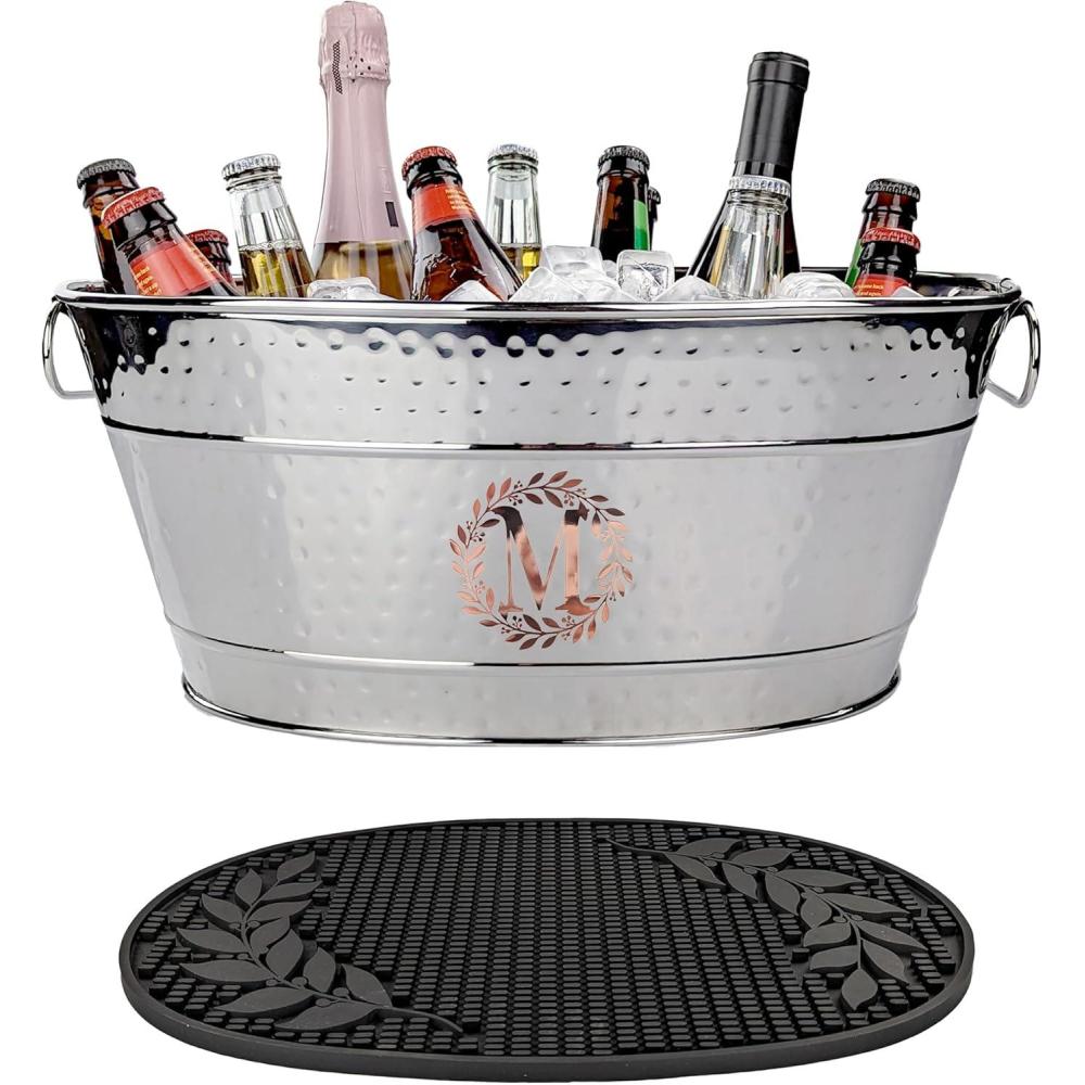 Personalized Beverage Tub Plus Insulated Bar Mat - Wedding Gifts, Housewarming, Bridal Shower Unique Gifts, Engagement Gifts for The Couple (15Qt. Copper + Mat)(15Qt. Silver + Mat)